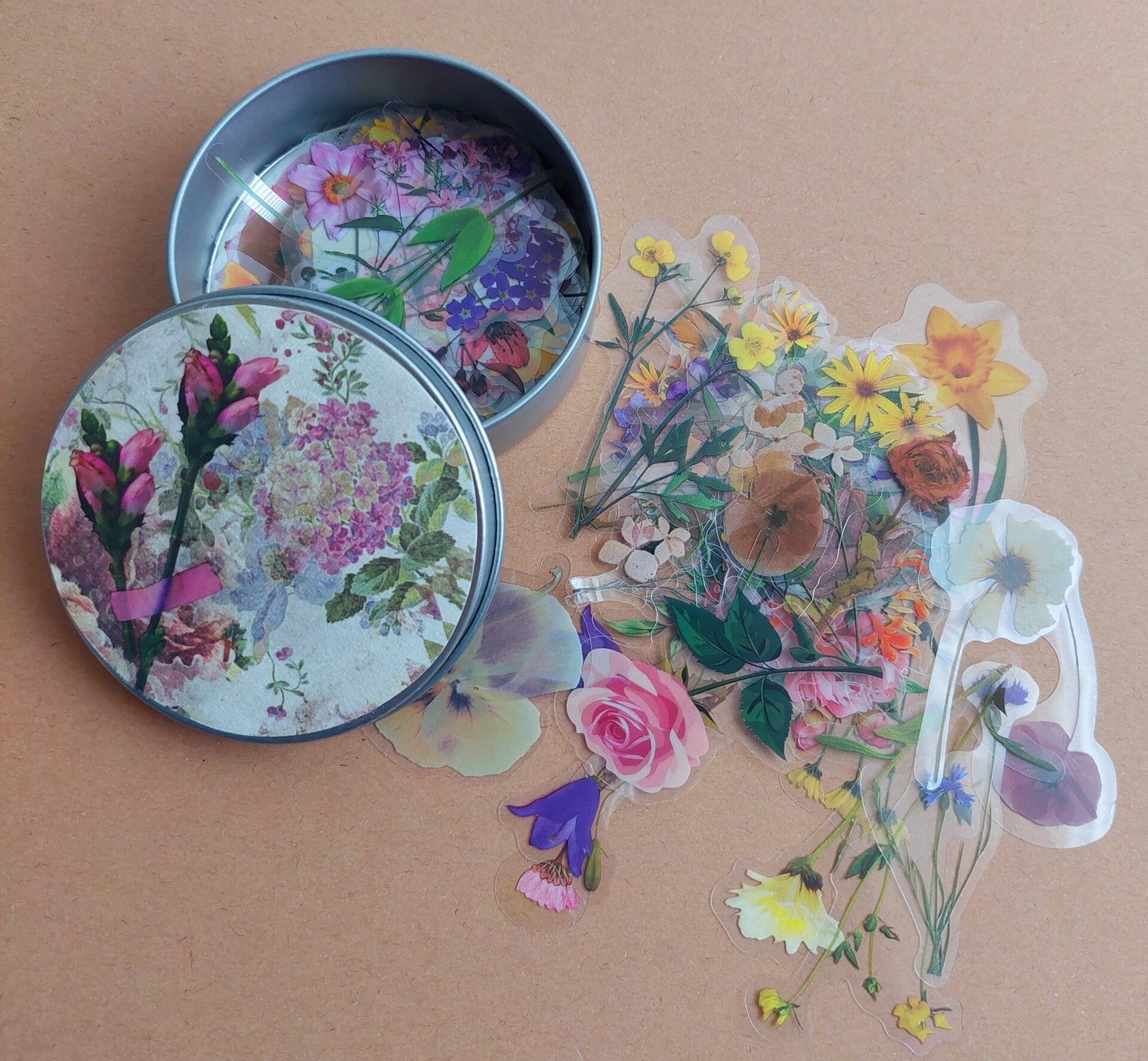 100 Transparante bloemenstickers in diverse afmetingen en kleuren.