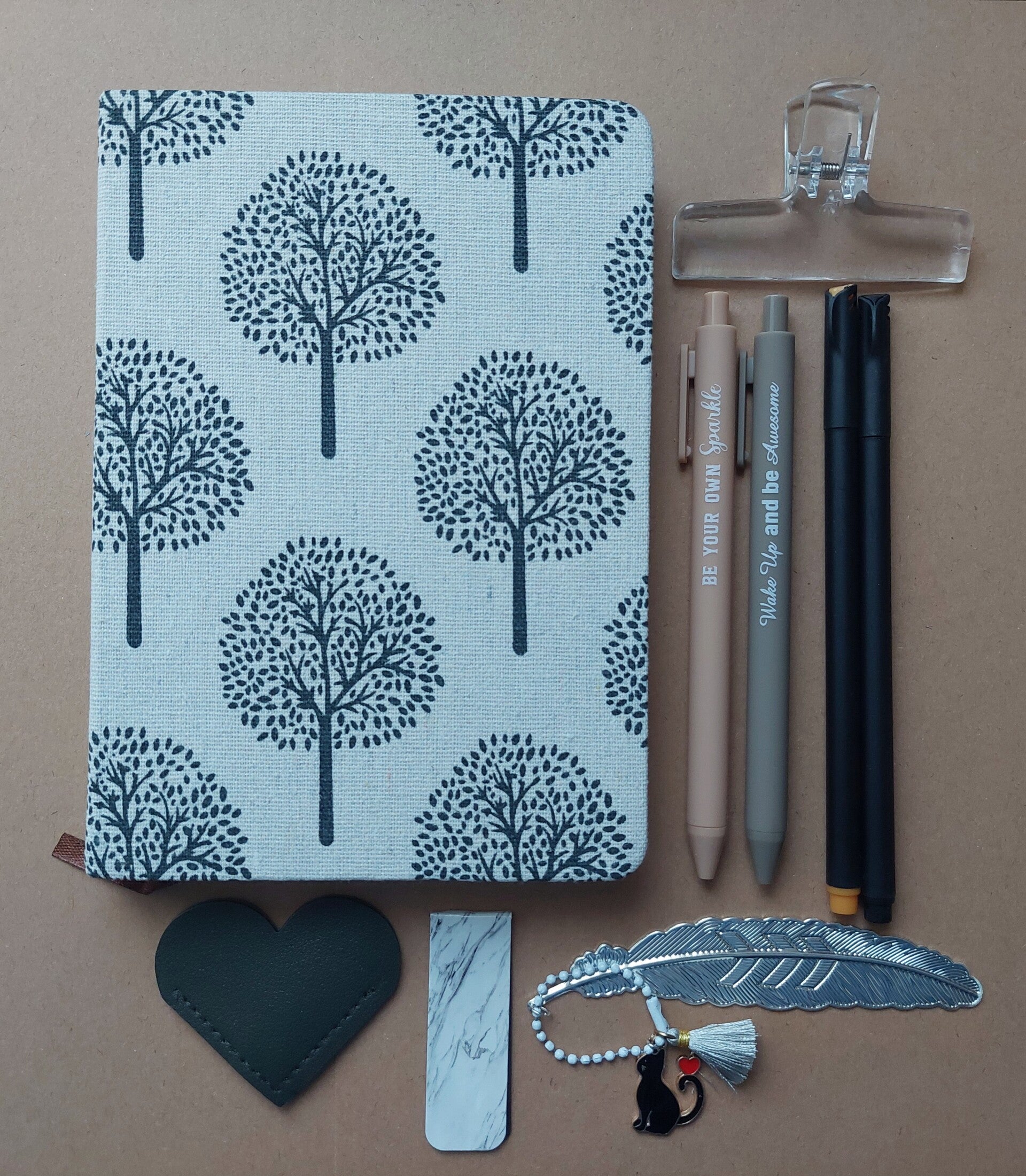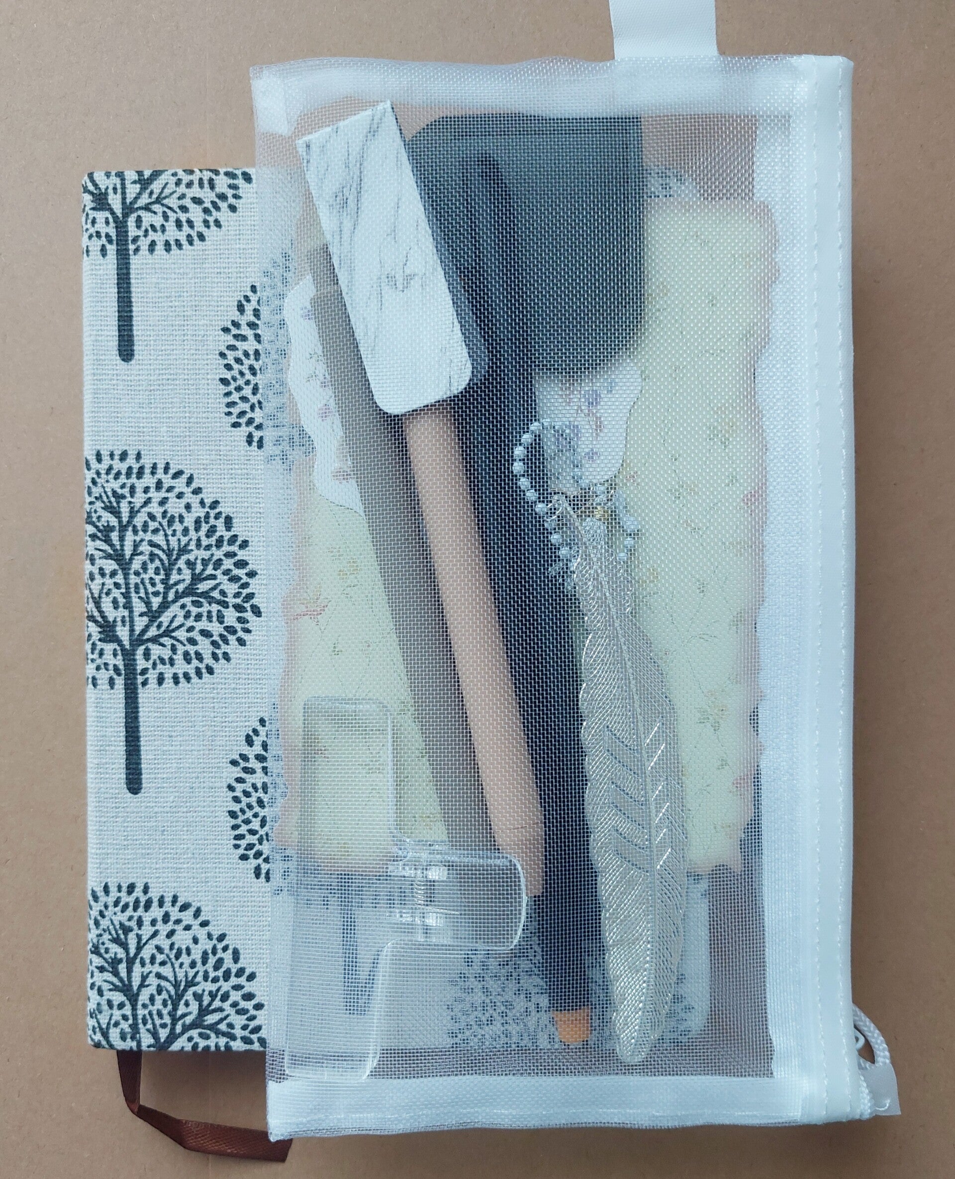 Leren hoekboekenlegger hart, klem, 2 fineliners, 2 pennen met affirmatietekst, magnetische boekenlegger, metalen bladwijzer veer. Alles in een doorzichtige etui.