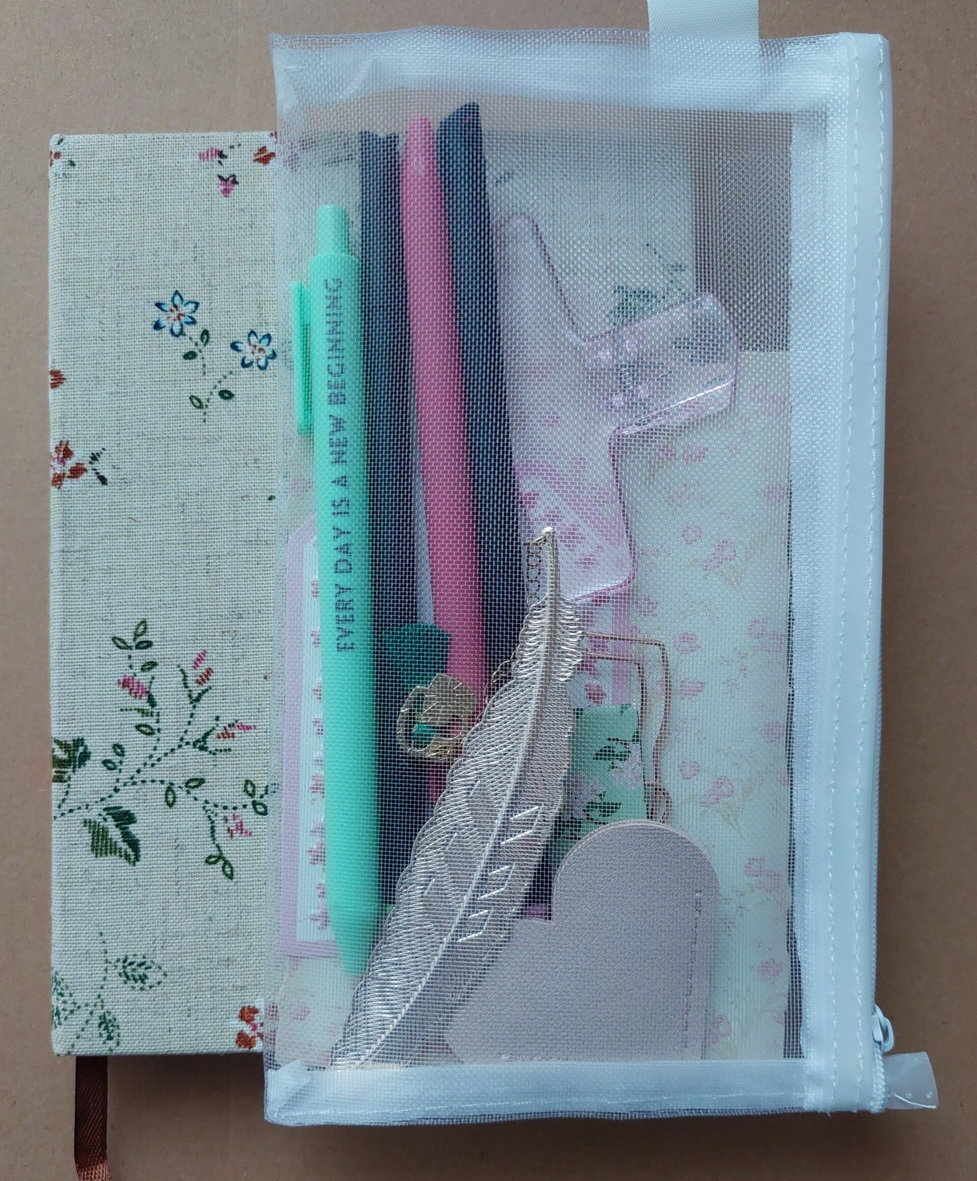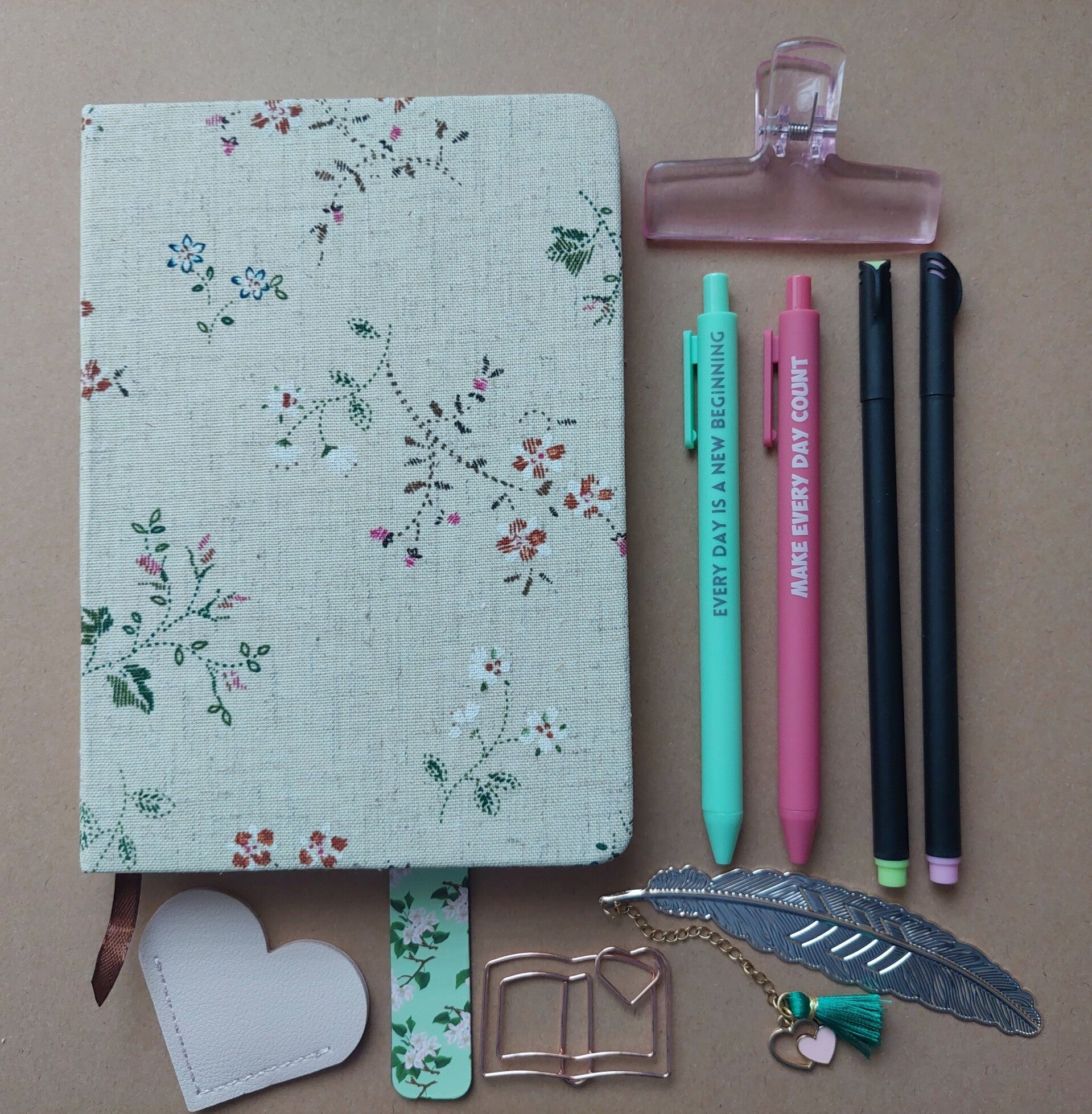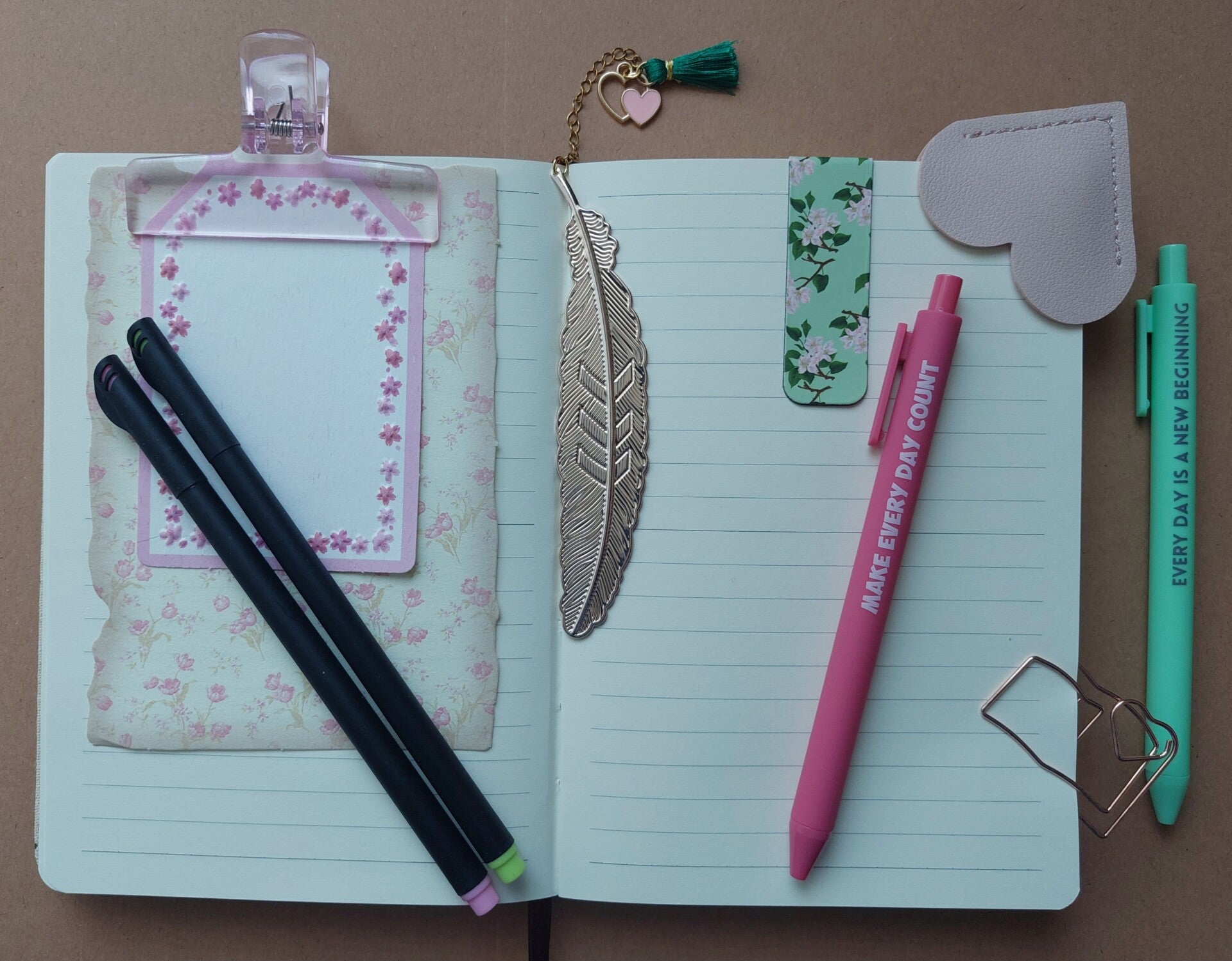 Leren hoekboekenlegger hart, klem, 2 fineliners, 2 pennen met affirmatietekst, magnetische boekenlegger, metalen bladwijzer veer. Alles in een doorzichtige etui.